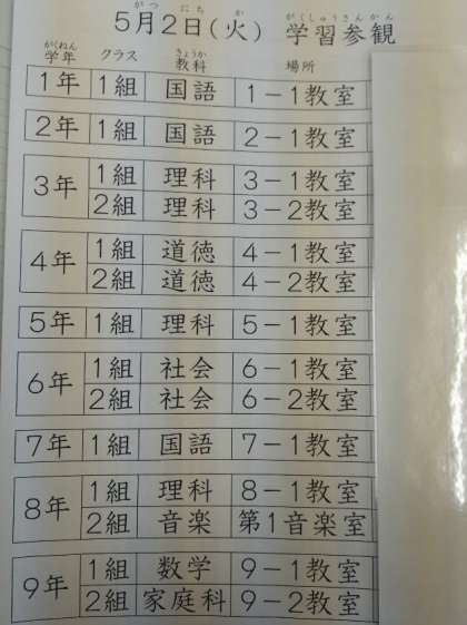 明日、5時間目(13:55〜)は、今年度最初の参観日です。お忙しいとは思いますが、ぜひ来校いただき子どもたちのがんばりを見てあげてください。