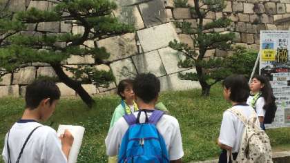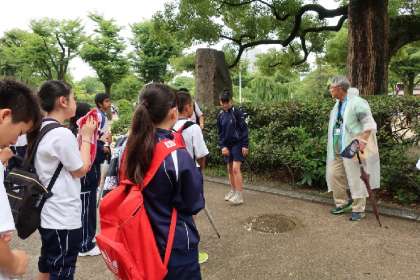 大阪城天守閣前から2班に分かれて、大阪観光ボランティアの方々にガイドをしていただきながら、戦跡めぐりを行いました。