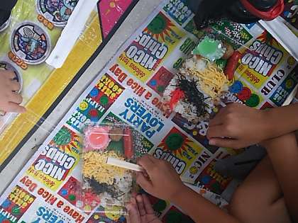予定よりもかなり早く到着しました。少し早目の昼御飯はちらし寿司です。みんな、美味しそうに食べています。