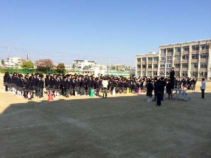 新1年を迎え、1年生から9年生まで全員がそろって、はじめての全校朝会を行いました。今日の校長先生のお話は、『避難訓練の大切さ』についてです。「『釜石の奇跡』と言われているが、奇跡ではありません。釜石の小中学生は、毎年、毎年、訓練を積み重ねてきました。その成果が出たのです。訓練を真剣に行うことが大切なのです。」