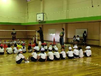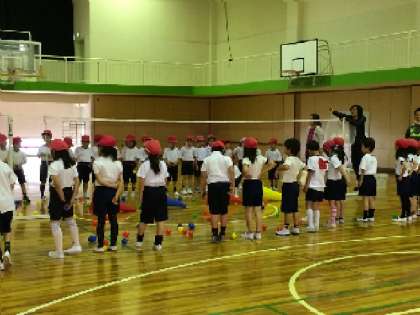 まずは、ルール説明。「投げる方と反対の足を前に出して、ネットを上を投げます。最後に、自分たちのコートにあるカラーボールを数えます。少ない方がたくさん投げたことになります。」