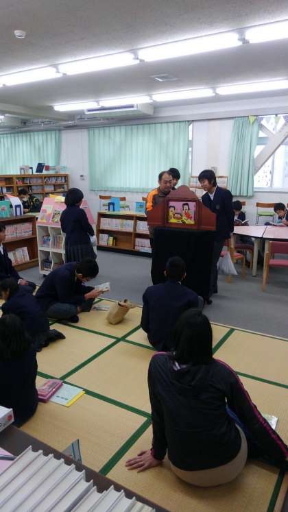 昼休みには中学校の図書文化委員のメンバーが「紙芝居」の読み聞かせを行います。また、小学校は「読書ビンゴ」 中学校は「しおり作り」と取り組みを行いますので、どんどん図書室に足を運んでください。