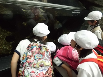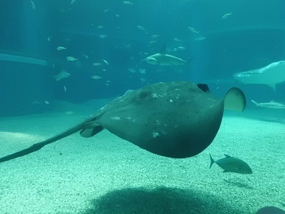 子どもたちは、1つ1つの水槽に立ち止まって見ていました。大きい水槽では、”えい”や”じんべいざめ”など大きな海の生物からとっても小さい生き物までが、ゆったりと泳いでいました。見ていると、時間が何時間あってもいいなと感じました。