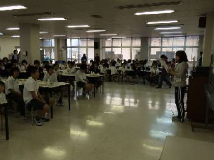 今日は「いただきますの日」です。最初に、栄養教諭の先生からのお話を聞いて・・・。それから、1年生から6年生まで、全員が声をそろえて「いただきます」をしました。今日のメニューは、みんなが大好きなカレーライスです。