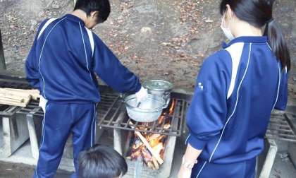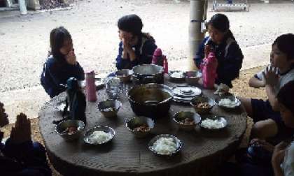 7年生一泊移住の2日目のプログラム〜野外炊事でのカレーライス作り。班ごとに、みんなで協力して、一生懸命作っていました。おいしいカレーができたかな?完成したカレーライスをいただきます!!