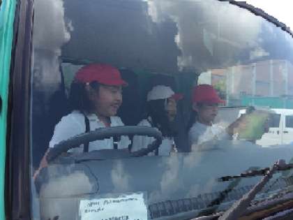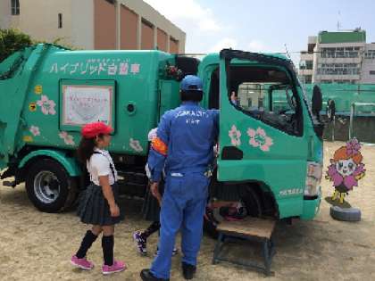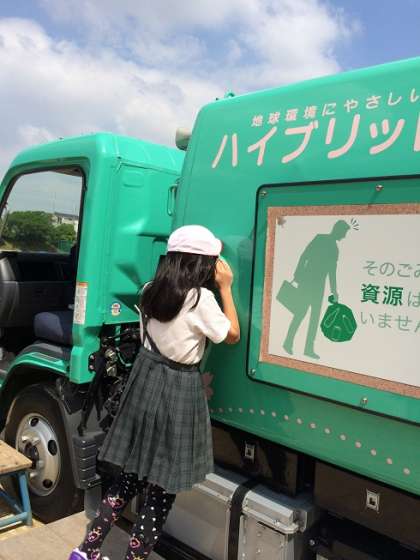 運転席にも乗せてもらいました。どこを触っても良いですよと言っていただいて、興味深く触っていました。車の前に立ててある人形の姿が見えにくいこと・・・運転席の視界を体験して、びっくりもしていました。車の横には、集めたごみを見ることができる窓もありました。パッカー車には、おもしろい秘密がいっぱいです。
