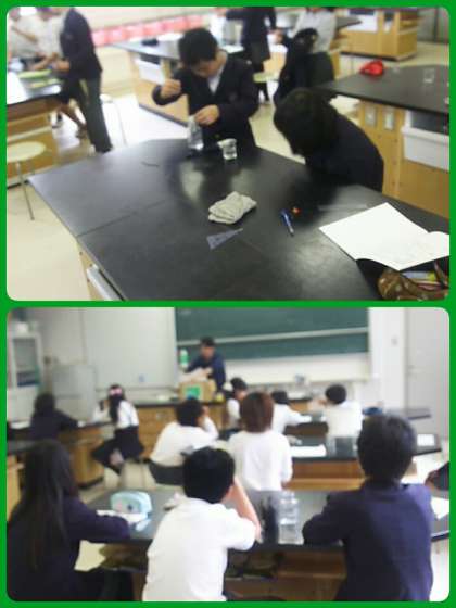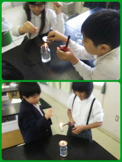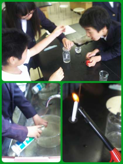 理科室で、6年生が実験をしていました。水上置換法で集めた二酸化炭素に、火のついたろうそくを入れています。結果をしっかりまとめて、テストにものぞみましょう。