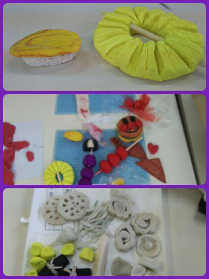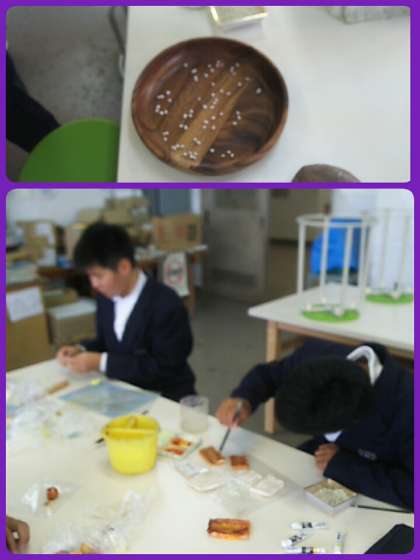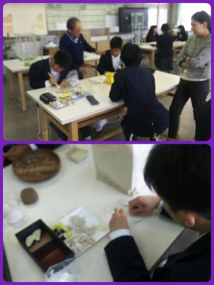 美術室では、8年生が食品サンプルを作っていました。お米や、数の子の1つぶ1つぶを丁寧に練っていったり、本物そっくりの卵の筋を再現したり、趣向を凝らした作品ができ上がってきています。