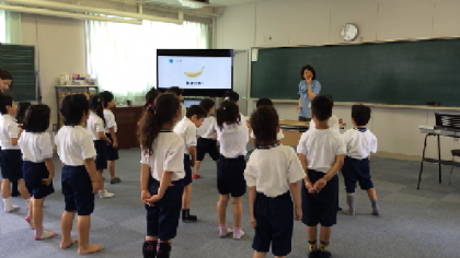 1年生にとっては、4回目の外国語活動です。今日は、「運動タイム」の後なので、体操服での活動です。みんな、いっぱい動いた後、どうかな〜と思いましたが、英語の歌が始まると、外国語活動に一挙に集中!!さあ〜、楽しい外国語活動の始まりです。
