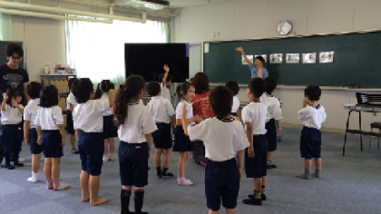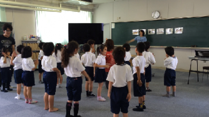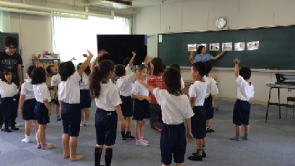 次は、友だちと向かい合って!先生が示すあいさつを、どちらが早く、正しくできるかやってみました!!みんな楽しく活動しています。
