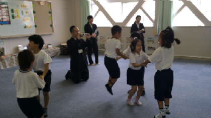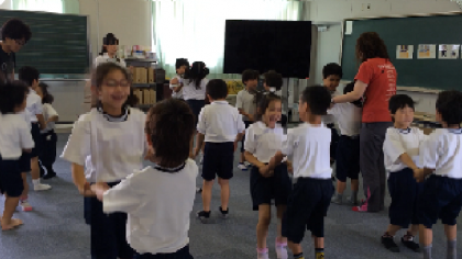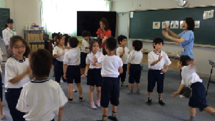 「Hello!Hello!〜」の歌を歌いながら、みんなで手をたたき合って、ジャンプして〜。とっても楽しそうです。今日は、大学の先生や外国語活動の先生をめざす大学生のみなさんも見に来てくれていました。楽しい活動の様子に、感動してくれていました。