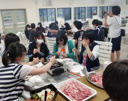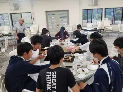 予定より早くホテルに到着し、入館式を行いました。お世話になります。よろしくお願いします。入室後は、夕食です。メニューはBBQ! みんなで楽しく美味しくいただきました。