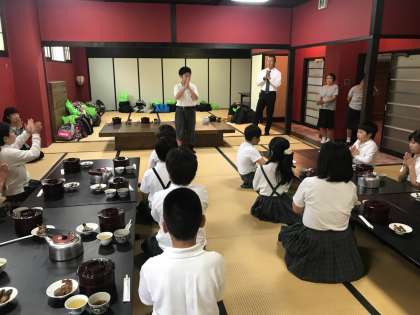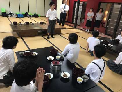 昼ごはんです。みんな釣った魚は35匹もありました! お腹いっぱいになったかな?