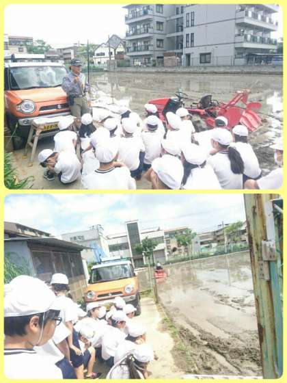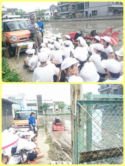 米作りを学んでいる5年生は、「しろかき」を見学しに行きました。土をかきならして、いよいよ来週は「田植え」を体験させてもらえます。楽しみですね。
