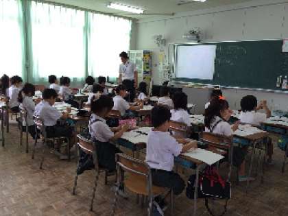3年生の今日の2時間目は、「算数」の学習です。問いができた友だちに、みんなで「good job!」と言っている声が響いていました。外国語活動の時間に覚えた英語を教室でも活用しているんですね。