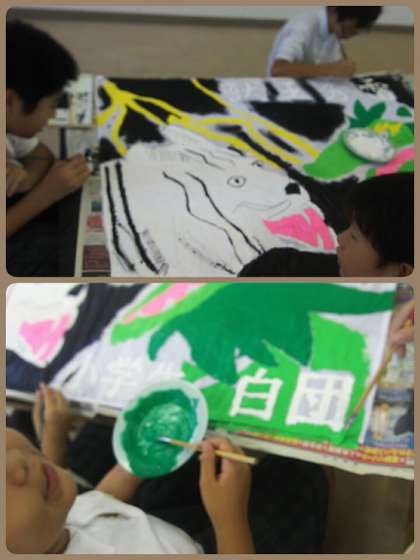 白団「獣王秀雷」、赤団「豪火猿嵐」のテーマのもと、体育祭の団旗を制作中です。色づかいも工夫して、5・6年生で協力しながら進めています。完成が楽しみです。