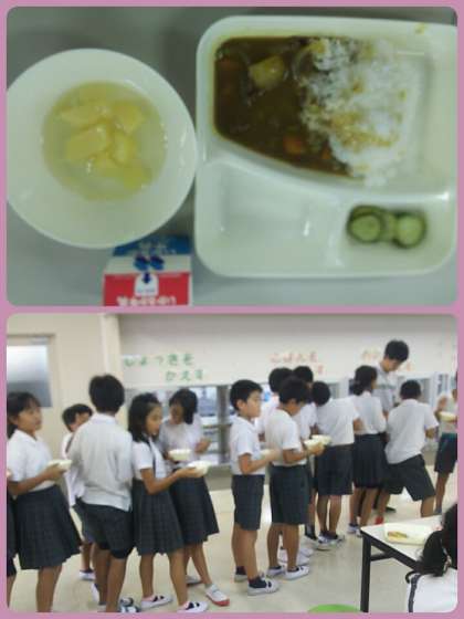 今日の給食はカレーライス。各学年のおかわりに、長い行列ができていました。おいしい給食を提供してくれている調理員さんにも、感謝の気持ちをもって、これからも元気もりもりたくさん食べましょう。
