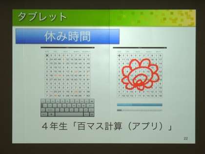 1つめの写真は、雨の日の休み時間の活用です。外で遊ぶことができないので、「百マス計算」を友だちと競い合っていました。その他にも、遊び感覚で学習できるソフトがたくさんあります。