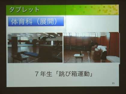 2つめの写真は、7年生の体育科の授業です。「跳び箱運動」の単元でタブレットを活用しました。自分が跳んだ姿をを動画として撮影し、設定した時間(0秒から15秒の間)遅れて再生してくれるアプリがあります。この機能を使うことによって、各自が自分の跳び方をその都度確認でき、跳び方を改善していくことができます。