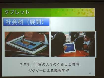3つめの写真は、7年生の社会の授業です。「世界の人々のくらしと環境」の学習でジグソー法による協働学習を行いました。その際に、タブレットのプレゼンテーションアプリやノートアプリを活用しました。熱帯・温帯・乾燥帯・高山帯・寒帯のグループに分かれ、暮らし・住居・衣服・食事・宗教について調べたことをまとめました。まとめたことを、グループに戻り、資料を提示しながら説明しました。