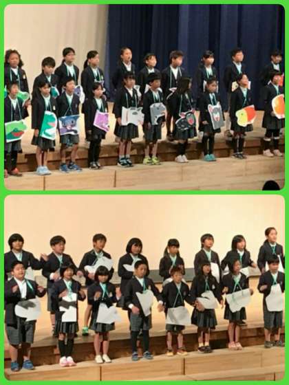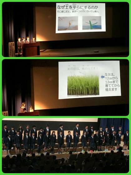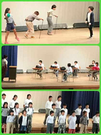 4年生は、英語の群読を上手な発音でがんばりました。5年生は、田植え体験と稲刈り体験で学んだことを中心に、プレゼンを作成して発表しました。6年生は、平和劇で戦争の悲惨さと命の大切さを全校児童生徒に伝えました。