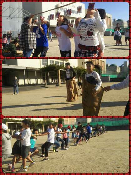 PTA主催の運動会が行われました。パン食い競争やあめちゃん釣りなど、学校の体育祭では見られない種目もあり、大変盛り上がりました。大人対子どもの綱引きは、白熱した勝負が見られました。