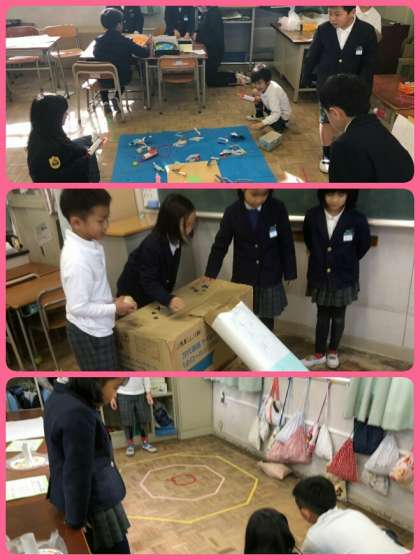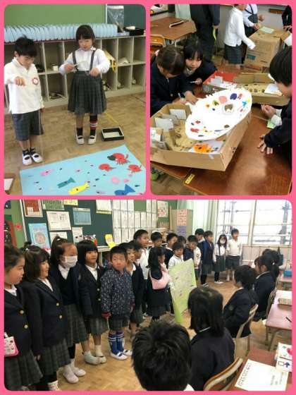2年生が1年生を招待して、おもちゃランドを開きました。ボウリング・わなげ・カーリング・魚つりなど、楽しく工夫されたコーナーばかりでした。2年生は説明も分かりやすくできていて、1年生は大満足の様子でした。
