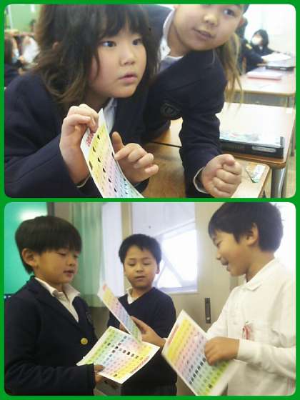 1年生は、算数でついに100までの数を学習しました。この日は、一の位と十の位に注目して、数列表を見ながら何か法則がないか考えました。最後は、友達と数字当てゲームをして、理解を深めました。