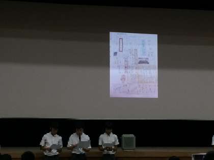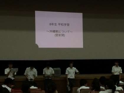 8年生は、1学期の平和学習で「沖縄戦」について調べました。その調べたことをもとに、各班で壁新聞を作成しました。今日の発表は、その学習を通して学んだ「沖縄戦」のことから「今の沖縄について」そして「平和について」各班から報告しました。