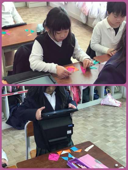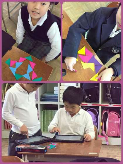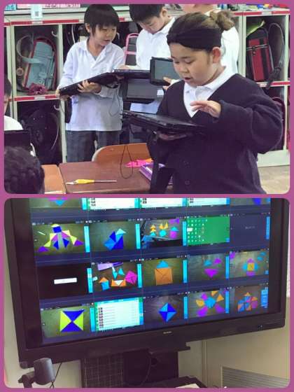 1年生は算数で、「かたちづくり」をしました。それぞれが作ったものをタブレットで撮影し、クラス全体で共有しました。同じ三角形でも、発想豊かに、様々なかたちができあがりました。