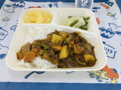 今日の献立は「ビーフカレーライス、野菜のピクルス、りんご(カット缶)、牛乳」でした。