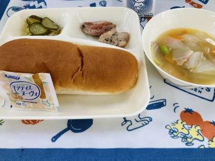 今日の献立は「鶏肉のバジル焼き、ベーコンと野菜のスープ煮、キャベツときゅうりのサラダ、コッペパン、みかんジャム、牛乳」でした。バジルは、シソ科の香草で、青じそに似た甘い香りがします。温かい気候でよく育つため、地中海沿岸で多く栽培されます。トマトと組み合わせて、イタリア料理によく使われます。生の葉をパスタのソースに使ったり、乾燥させて、スープやトマトソースに入れたりします。