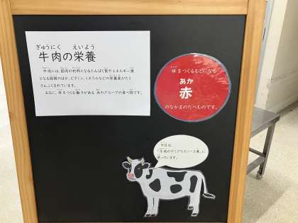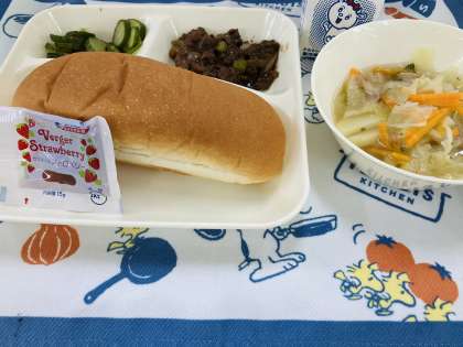 今日の献立は「牛肉のデミグラスソース煮、ウインナーのスープ、きゅうりのピクルス、コッペパン、いちごジャム、牛乳」でした。牛肉のデミグラスソース煮は、牛肉とたまねぎをいためて、デミグラスソースやウスターソース、ケチャップなどで味をつけて煮ています。今日の給食に使われているデミグラスソースは、米粉を使っているため、小麦アレルギーがある児童生徒も食べることができます。