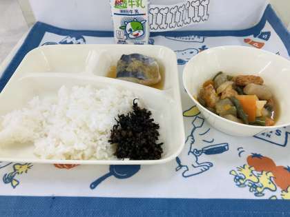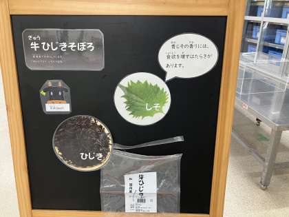 今日の献立は「さごしのおろしじょうゆかけ、含め煮、牛ひじきそぼろ、ごはん、牛乳」でした。牛ひじきそぼろは、牛ひき肉とひじきをいため、甘辛く味つけし、しそを加えて風味を増しています。
