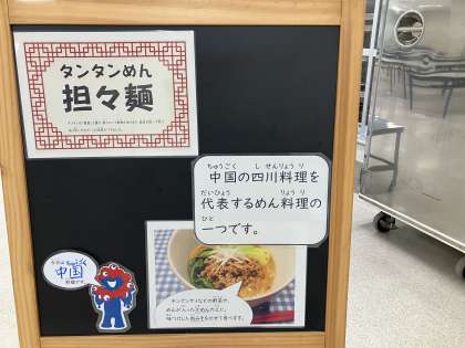タンタンめんは、中国の四川料理を代表するめん料理の一つです。給食のタンタンめんは、チンゲンサイなどの野菜やめんが入った汁めんの上に、味つけした肉みそをのせて食べます。