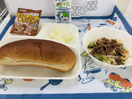 今日の献立は「タンタンめん、キャベツの甘酢づけ、おさつチップス、黒糖パン、牛乳」でした。