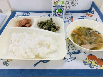 10/29の献立は「鶏肉のチリソース焼き、焼き豚のスープ、ツナとさんどまめのいためもの、ごはん、牛乳」でした。チリソースは、とうがらしに塩やスパイスを合わせたソースのことです。