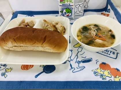 今日の献立は「あげギョーザ、中華みそスープ、れんこんの中華だれかけ、黒糖パン、牛乳」でした。