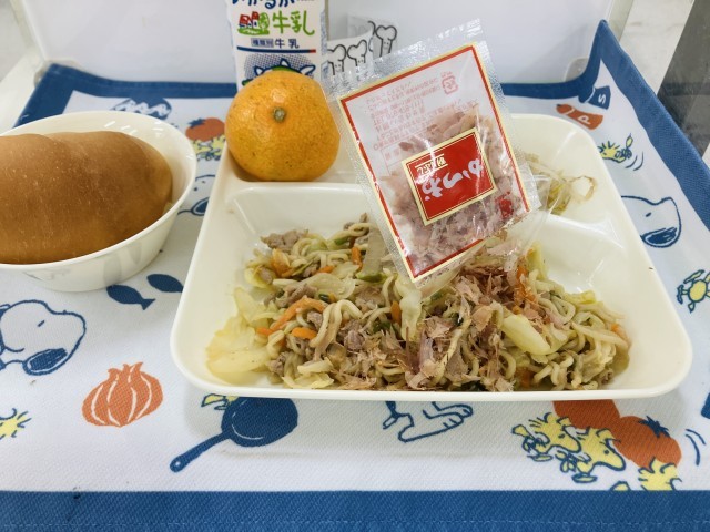 今日の献立は「和風焼きそば(かつおぶし)、もやしのしょうがづけ、みかん、ミニコッペパン、牛乳」でした。