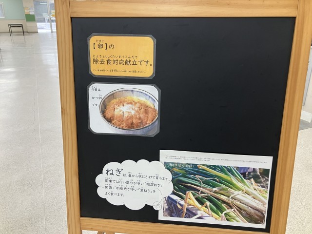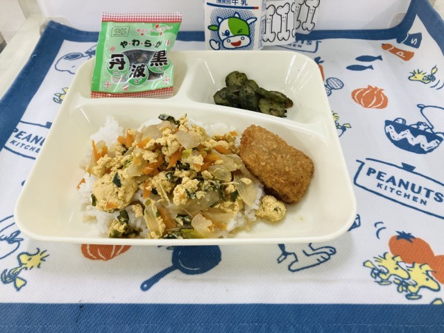 今日の献立は「カツ丼、きゅうりの赤じそあえ、ソフト黒豆、牛乳」でした。カツ丼は、「卵」の除去食対応献立です。