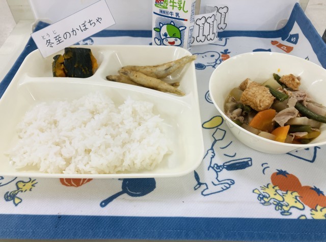 今日の献立は「きびなごてんぷら、豚肉とあつあげの煮もの、焼きかぼちゃの甘みつかけ、ごはん、牛乳」でした。
