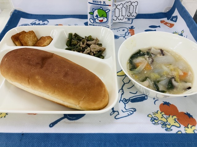 今日の献立は「はくさいのとろみ煮、あつあげのピリ辛じょうゆかけ、豚肉とさんどまめのオイスターソースいため、おさつパン、牛乳」でした。