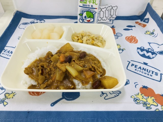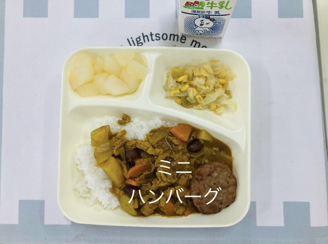 1/13の献立は「豚肉と金時豆のカレーライス、中学校:焼きミニハンバーグ、サワーソテー、和なし(カット缶)、牛乳」でした。
