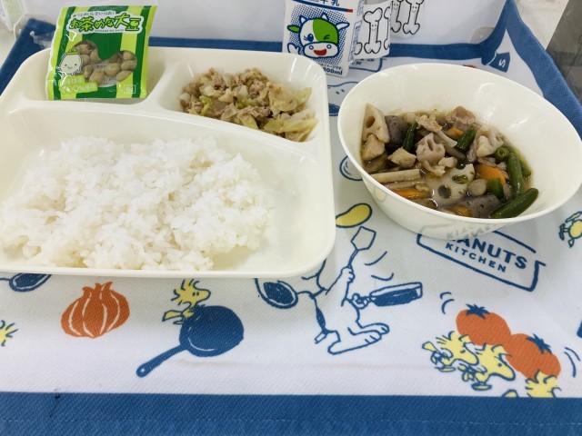 今日の献立は「筑前煮、ツナとキャベツのごまいため、まっ茶大豆、ごはん、牛乳」でした。