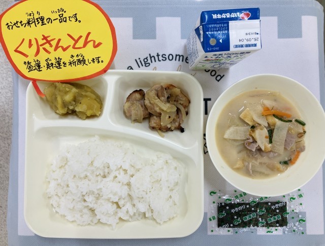 今日の献立は「鶏肉の塩こうじ焼き、かす汁、くりきんとん、ごはん、牛乳、中学校:焼きのり」でした。かす汁は、酒かすを入れた具だくさんの汁ものです。酒かすの働きで体が温まるので、冬に食べられることが多いです。給食のかす汁には、豚肉、つきこんにゃく、うすあげ、だいこん、にんじん、青ねぎが入っていました。