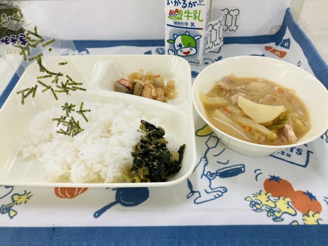 今日の献立は「こまつなっ葉めし(きざみのり)、さけの和風マリネソースかけ、じゃがいもとベーコンのみそ汁、牛乳」でした。東成区中本小学校のみなさんが考えた作品です。