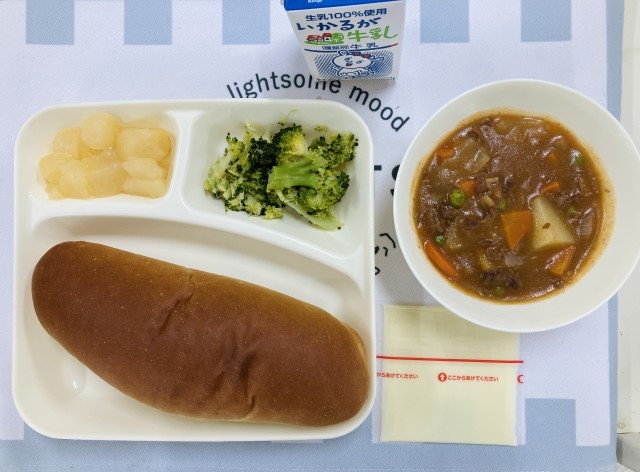 今日の献立は「ビーフシチュー、ブロッコリーのサラダ、スライスチーズ、中学校:洋なし(カット缶)、黒糖パン、牛乳」でした。