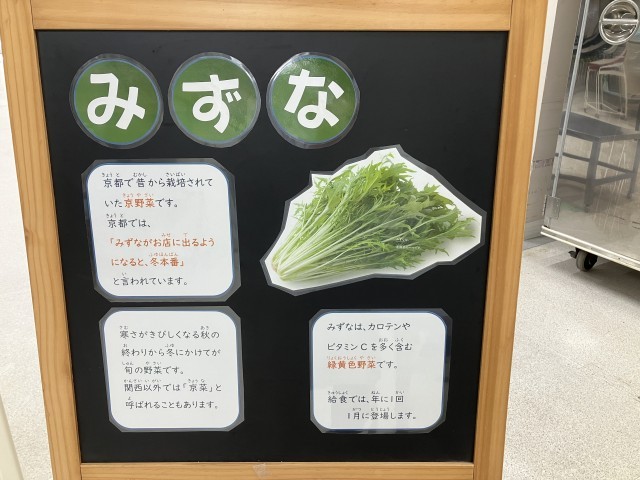 みずなは、カロテンやビタミンCを多く含む緑黄色野菜です。給食では、1年に1回、1月に登場します。京都で昔から栽培されていた京野菜です。