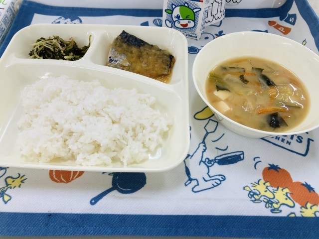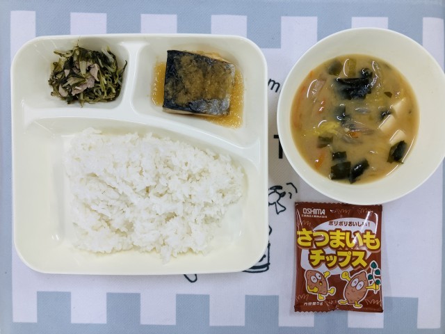 今日の献立は「さごしのみぞれかけ、みそ汁、みずなの煮びたし、中学校:おさつチップス、ごはん、牛乳」でした。