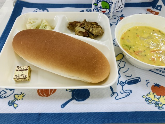 今日の献立は「豚肉のカレー風味焼き、コーンスープ、カリフラワーのピクルス、コッペパン、バター、牛乳」でした。